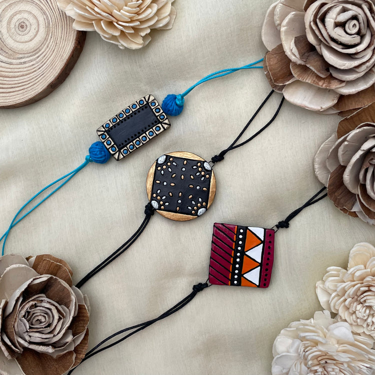 About the Product: This is a bond of love, a bond of togetherness; it’s a thread that binds our lives and our hearts. Terracotta eco-friendly rakhis handcrafted to perfection in rustic shades. The rakhi comes with nylon thread. The names can be customised on the rakhis.