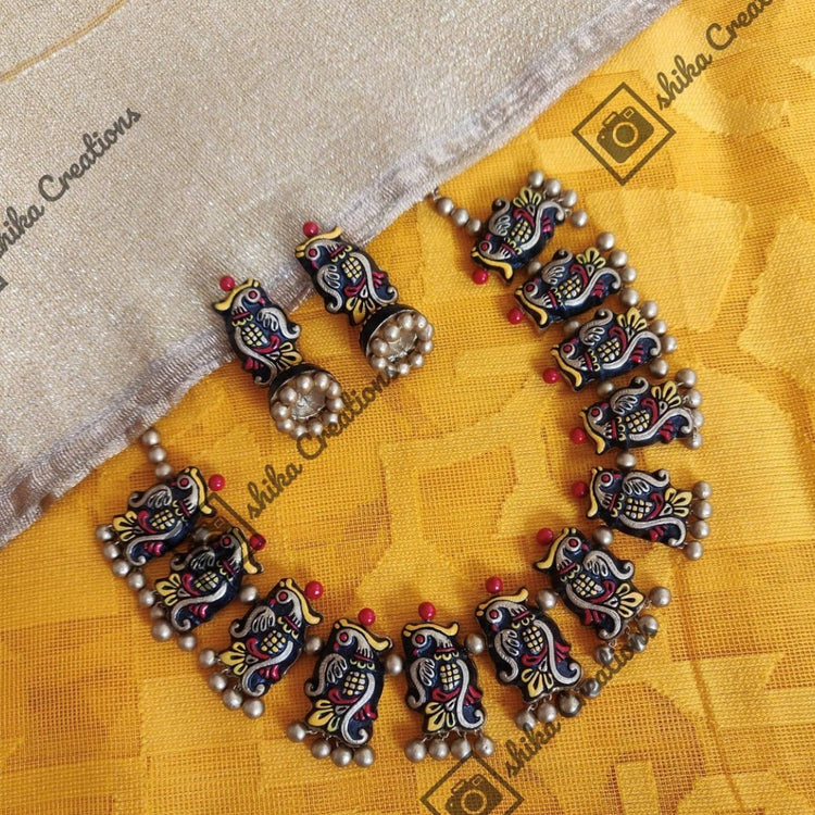 About the Product: This delicate piece of Shika is handcrafted to perfection.Your every moment deserves an elegance and we tune in. Terracotta pecock neckwear with jhumkas in summer hues. The neckwear comes with adjustble dori for the closure.