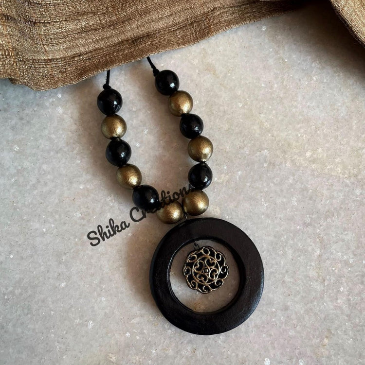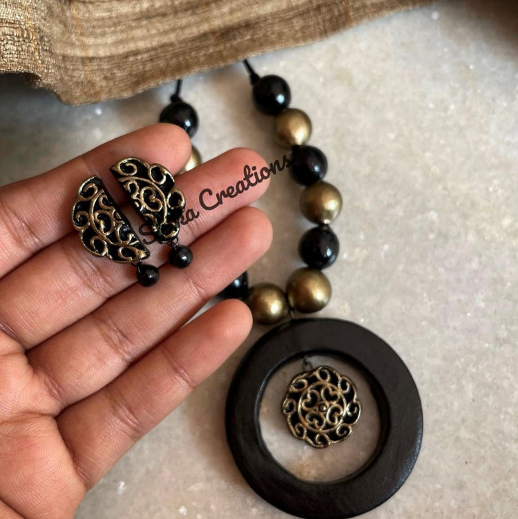 About the Product: Shika's regular wear sets are simple, goes with everything, and can be worn every day to get a sophisticated look. Terracotta pendant with studs in the most favourite black and antique shades.The neckwear comes with an adjustable dori for the closure.