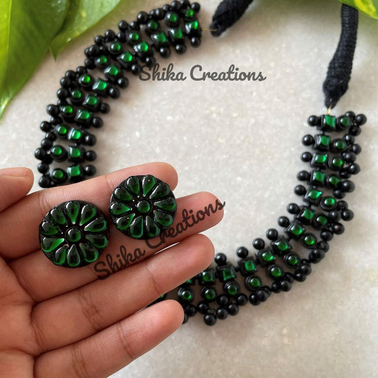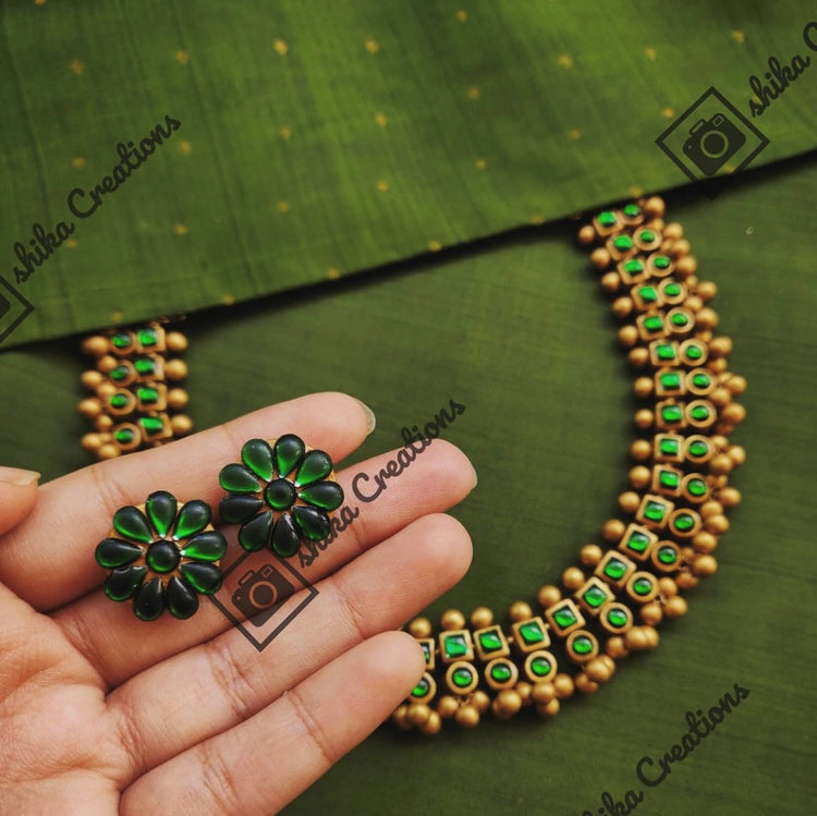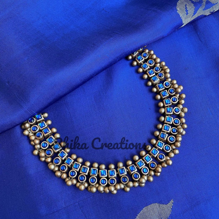 About the Product: Shika blended terracotta with kundhans to get a new stunning look for your outfit. What makes this more special is that this is completely handcrafted. Terracotta neckwear and studs with kundhan stone embellishments. The neckwear comes with adjustble chain for the closure.