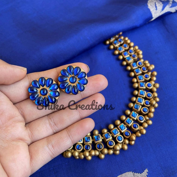 About the Product: Shika blended terracotta with kundhans to get a new stunning look for your outfit. What makes this more special is that this is completely handcrafted. Terracotta neckwear and studs with kundhan stone embellishments. The neckwear comes with adjustble chain for the closure.