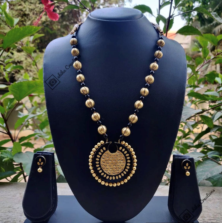 About the Product: This delicate piece of Shika is handcrafted to perfection.Your every moment deserves an elegance and we tune in. Terracotta neckwear with studs in the favourite gold and black shades.The neckwear comes with adjustble thread for the closure.