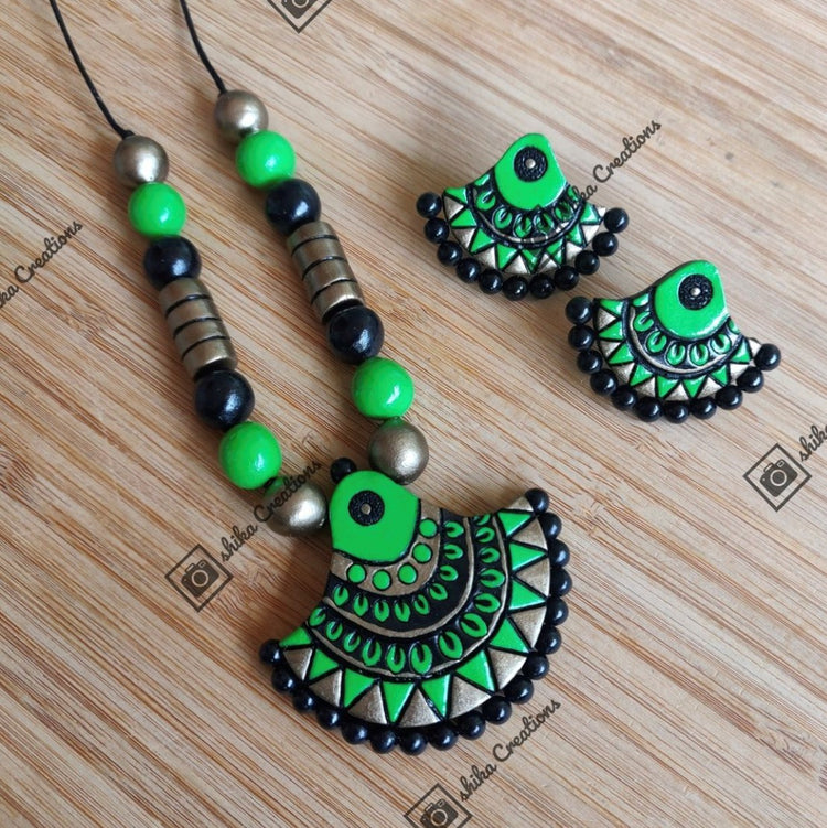 About the Product: Shika's regular wear sets are simple, goes with everything, and can be worn every day to get a sophisticated look. Terracotta pendant with studs in classic green shades.The neckwear comes with an adjustable dori for the closure. .