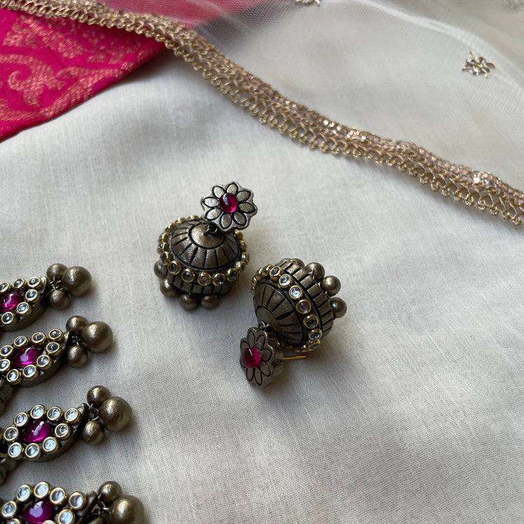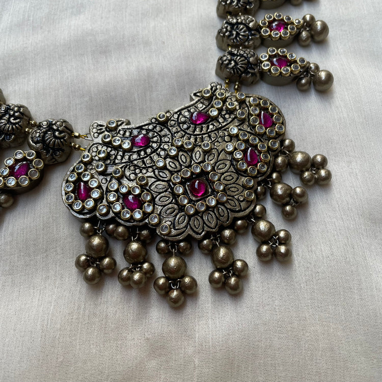 About the Product: This delicate piece of Shika is handcrafted to perfection.Your every moment deserves an elegance and we tune in. Terracotta neckwear with jhumkas in the endless antique shades with kundhan and kemp stone embellishments.The neckwear comes with adjustable thread for the closure.