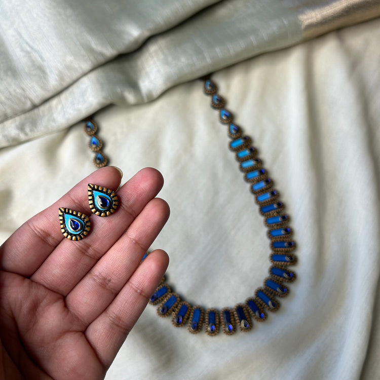 About the Product: This delicate piece of Shika is handcrafted to perfection.Your every moment deserves an elegance and we tune in. Terracotta neckwear with studs in a blue and golden wrap with Kundhan stones embellishments.The neckwear comes with adjustable thread for the closure.