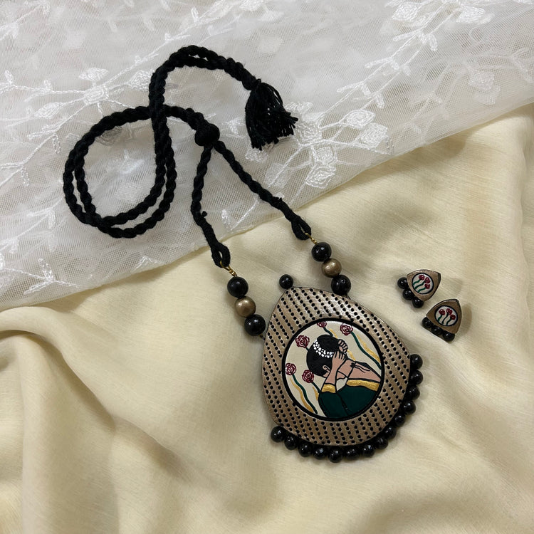 About the Product: Shika's regular wear sets are simple, goes with everything, and can be worn every day to get a sophisticated look. Terracotta pendant with studs in stunning shades. The neckwear comes with an adjustable dori for the closure.