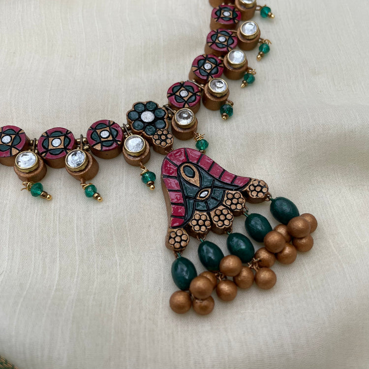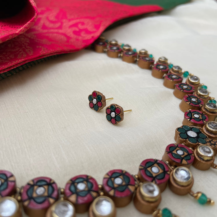 About the product - Signatures of Shika! Terracotta neckwear in stunning hues with kundhan stone embellishments . It is paired with studs. The set comes with an adjustable thread for the closure.