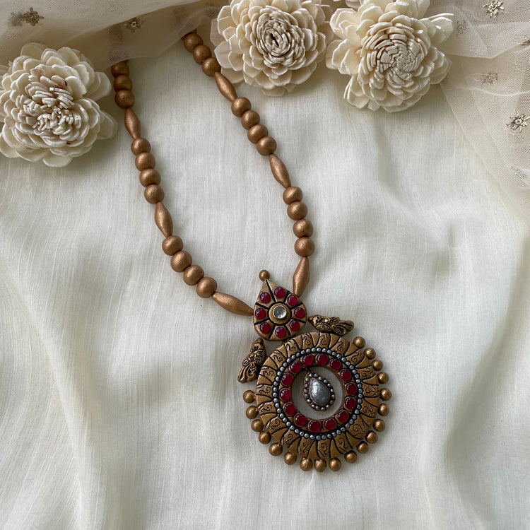 About the product - Signatures of Shika! Terracotta Necklace wrapped in gold with kemp stone embellishments. It is paired with jhumkas. The set comes with an adjustable thread for the closure.