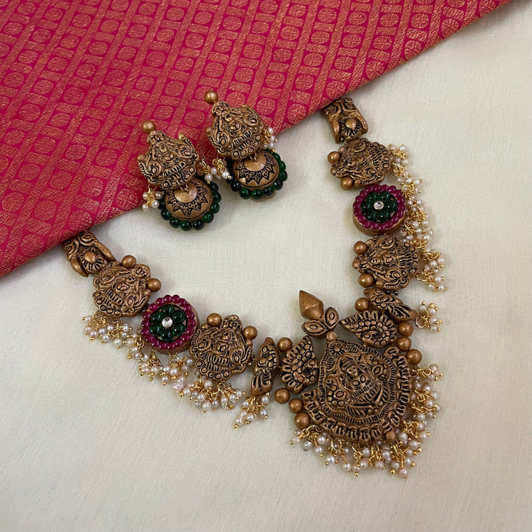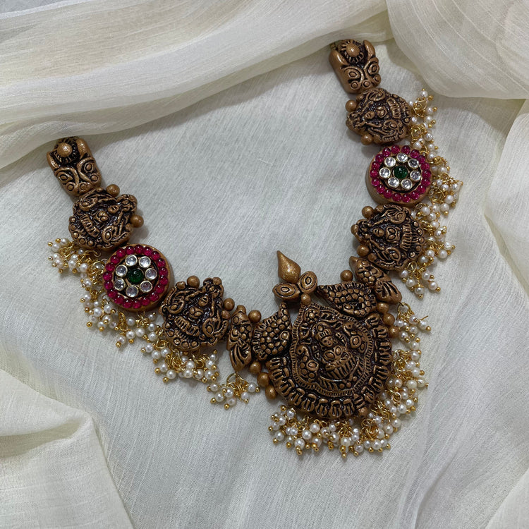 About the product: Shika Blended Terracotta With Kemp Stones To Get A Brilliant New Look For Your Outfit. Kemp Stones Are Semi-Precious Stones And They Dazzle In Bright Ambiance. What Makes This More Special Is That This Is Completely Handcrafted. Terracotta Traditional Neckwear And Jhumkas With Kemp And Kundhan Stone Embellishments And Pearl Danglers. The Neckwear Comes With Adjustable Chain For The Closure.