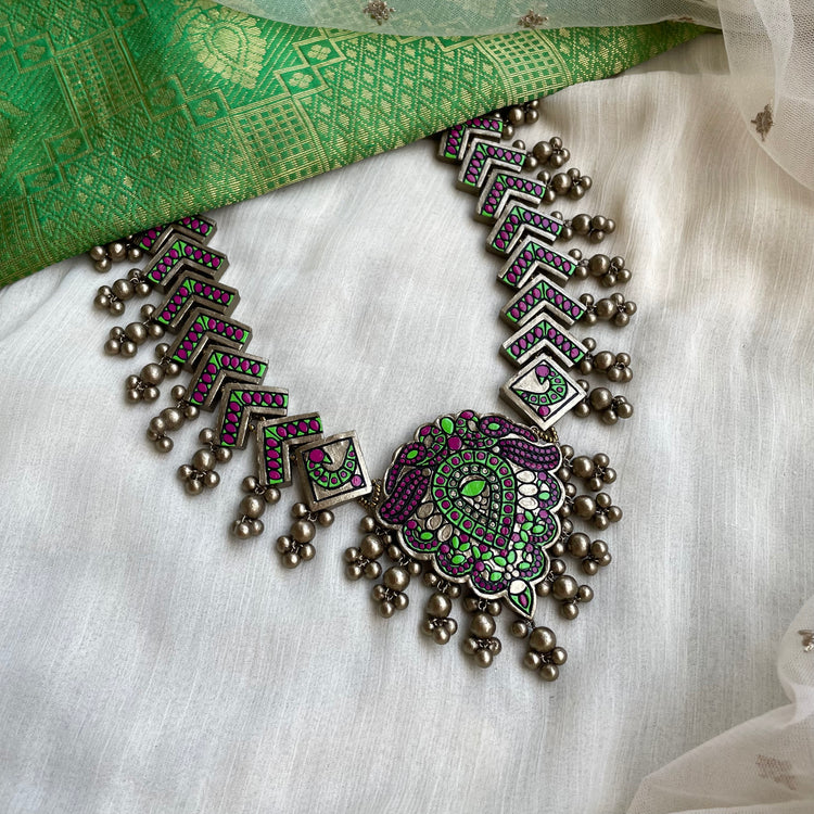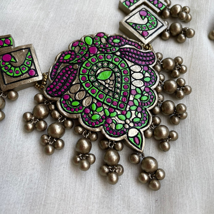 About the Product: This delicate piece of Shika is handcrafted to perfection.Your every moment deserves an elegance and we tune in. Terracotta traditional neckwear with jhumkas in the vibrant purple and green shades.The neckwear comes with adjustable thread for the closure.