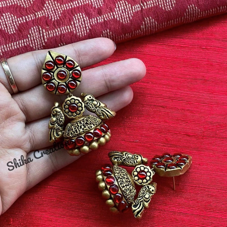 About the Product: Shika blended terracotta with kundhans to get a new stunning look for your outfit. What makes this more special is that this is completely handcrafted. Terracotta peacock neckwear and jhumkas with red kundhan stone embellishments. The neckwear comes with adjustble chain for the closure.