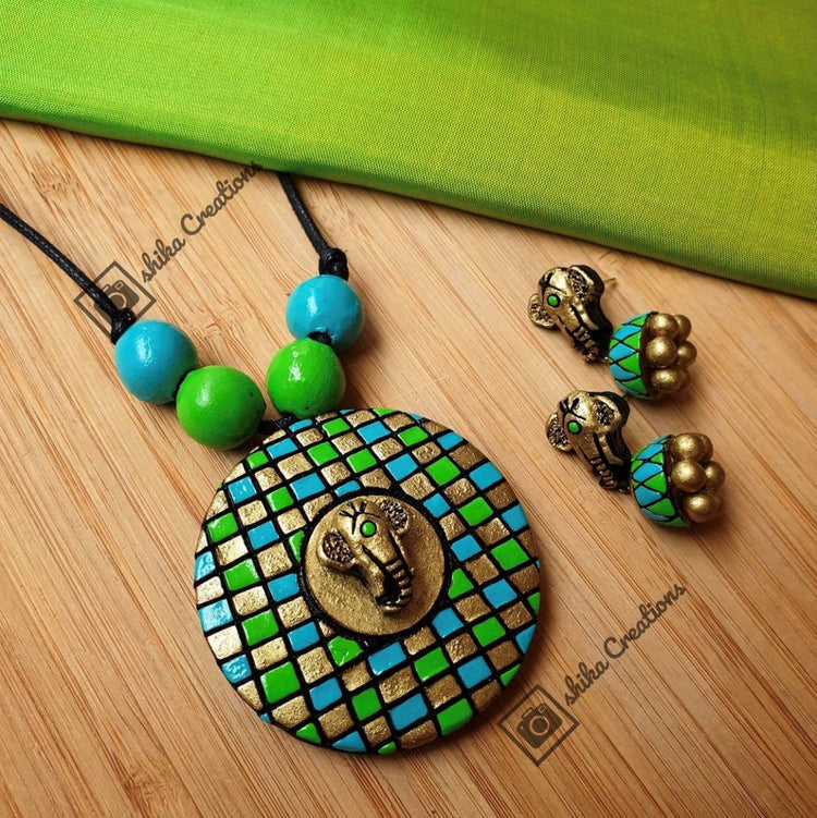 About the Product: Shika's regular wear sets are simple, goes with everything, and can be worn every day to get a sophisticated look. Terracotta ganesha pendant with tiny pretty jhumkas in vibrant shades.The neckwear comes with an adjustable dori for the closure.