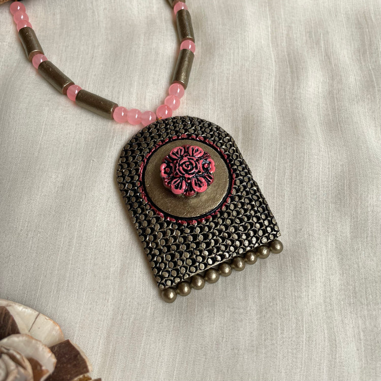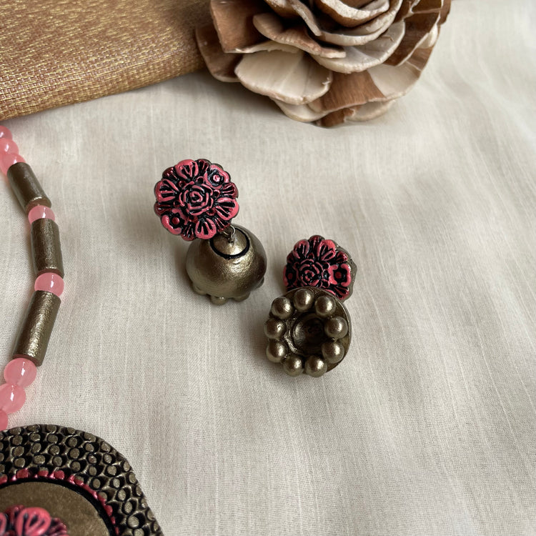 About the Product: Shika's regular wear sets are simple, goes with everything, and can be worn every day to get a sophisticated look. Terracotta floral pendant with jhumkas in antique and flesh shades. The neckwear comes with an adjustable dori for the closure.