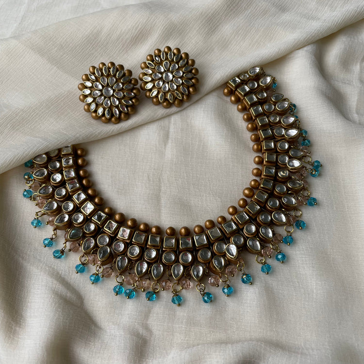 About the Product: Shika blended terracotta with kundhans to get a new stunning look for your outfit. What makes this more special is that this is completely handcrafted. Terracotta neckwear and studs with kundhan stone embellishments to suit to any ethnic and traditional outfit. The neckwear comes with adjustble chain for the closure.