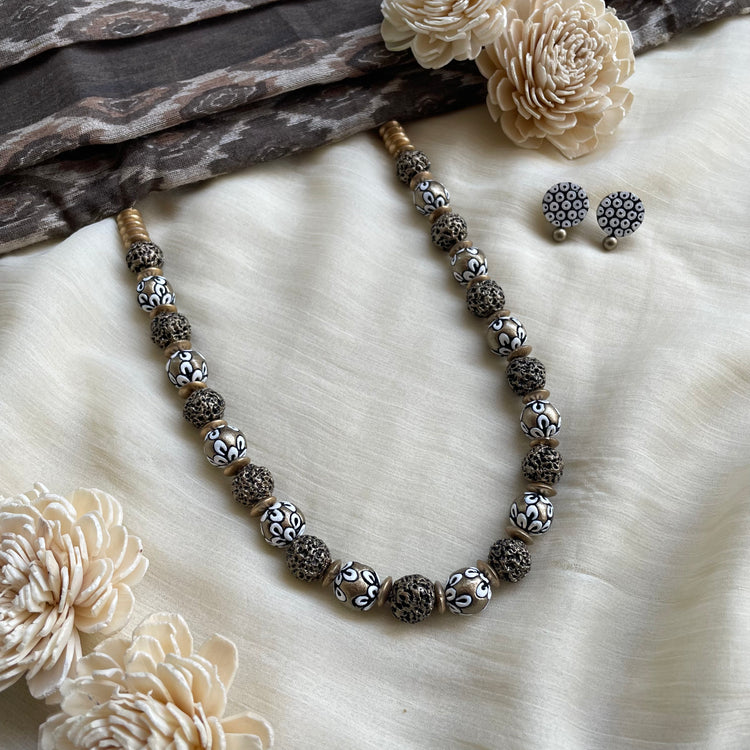 About the Product: This delicate piece of Shika is handcrafted to perfection.Your every moment deserves an elegance and we tune in. Terracotta beaded neckwear with studs in the neutral subtle shades that suits any outfit.The neckwear comes with adjustable thread for the closure.