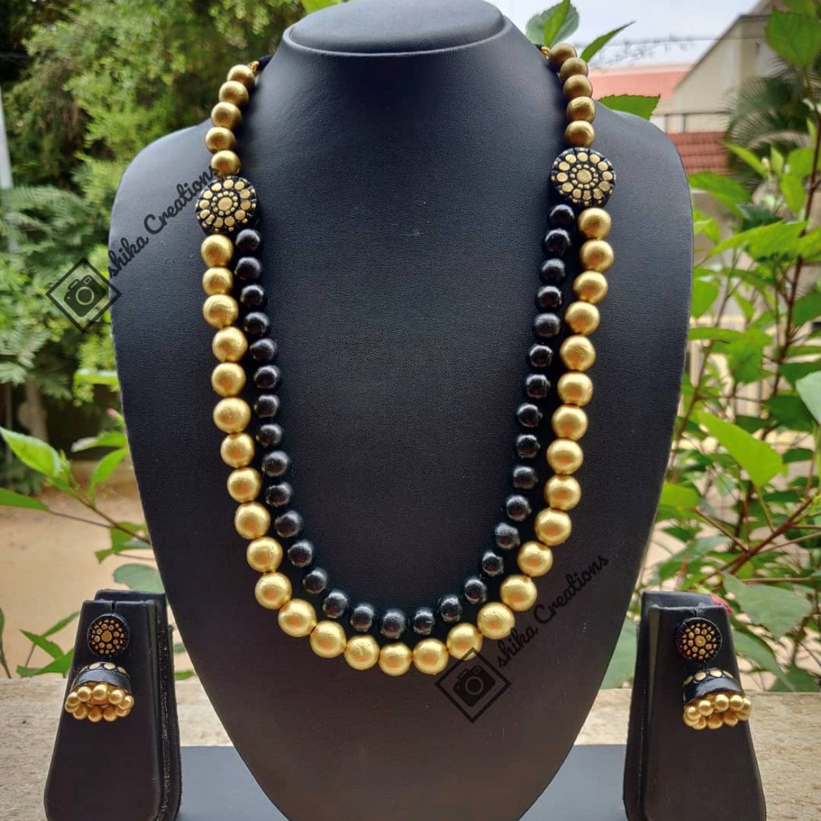 About the Product: Shika handcrafts and handpaints each and every bead with perfection. Terracotta 2 layered beaded neckwear with jhumkas in classic shades. The neckwear comes with adjustable dori for the closure.