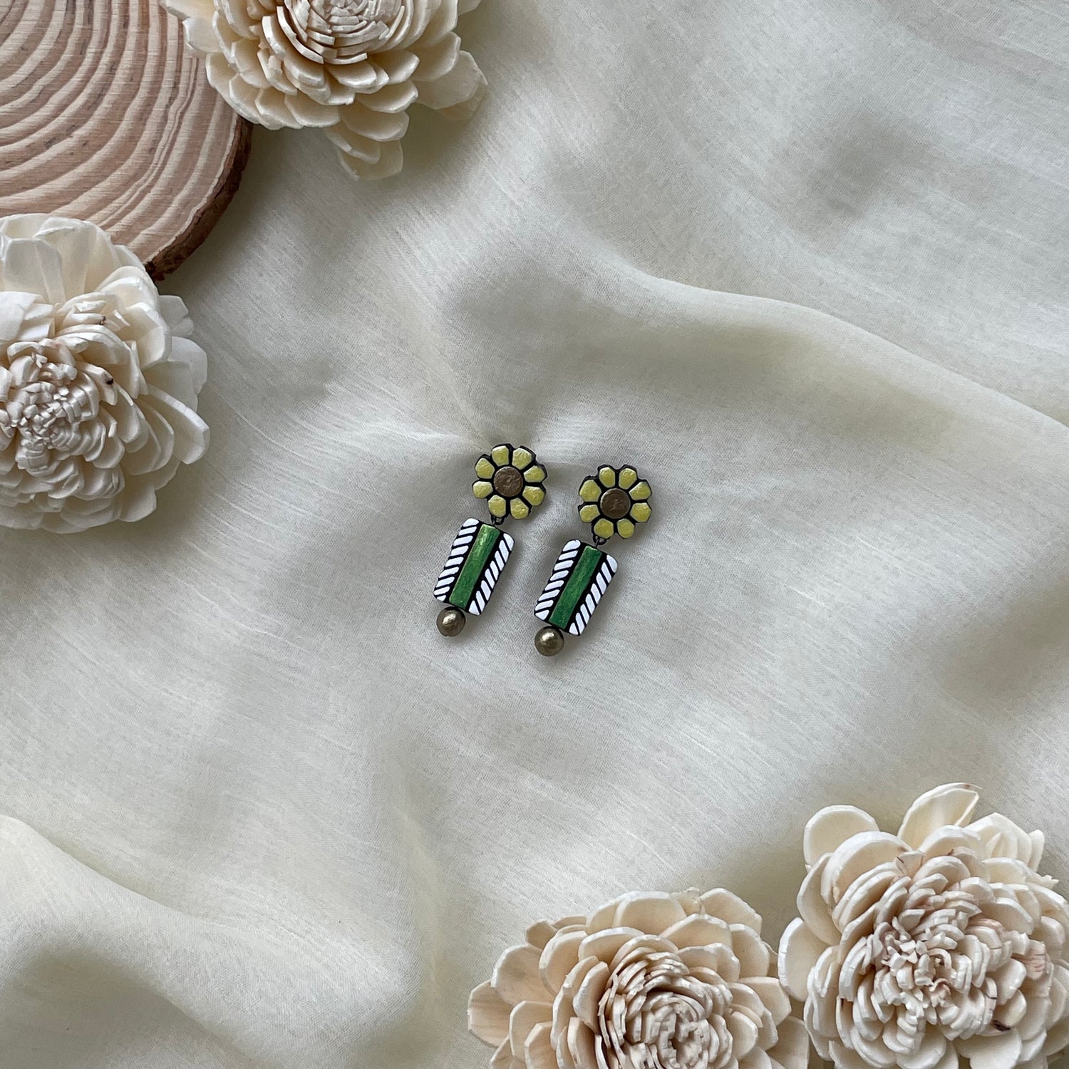 About the Product: Shika's handcrafted danglers are statement earrings that are great for making a powerful impressions. Terracotta 2 step dangling studs in amusing shades.