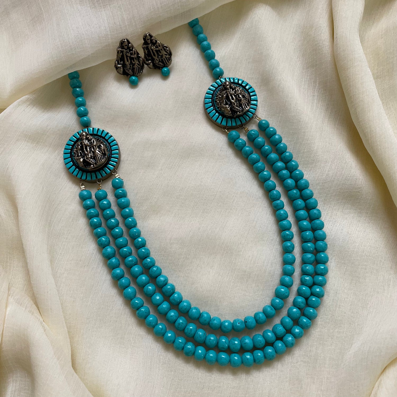 About the Product: Shika handcrafts and hand paints each and every bead with perfection. Terracotta 3 layered krishna beaded neckwear with studs in blush shades. The neckwear comes with adjustable dori for the closure.