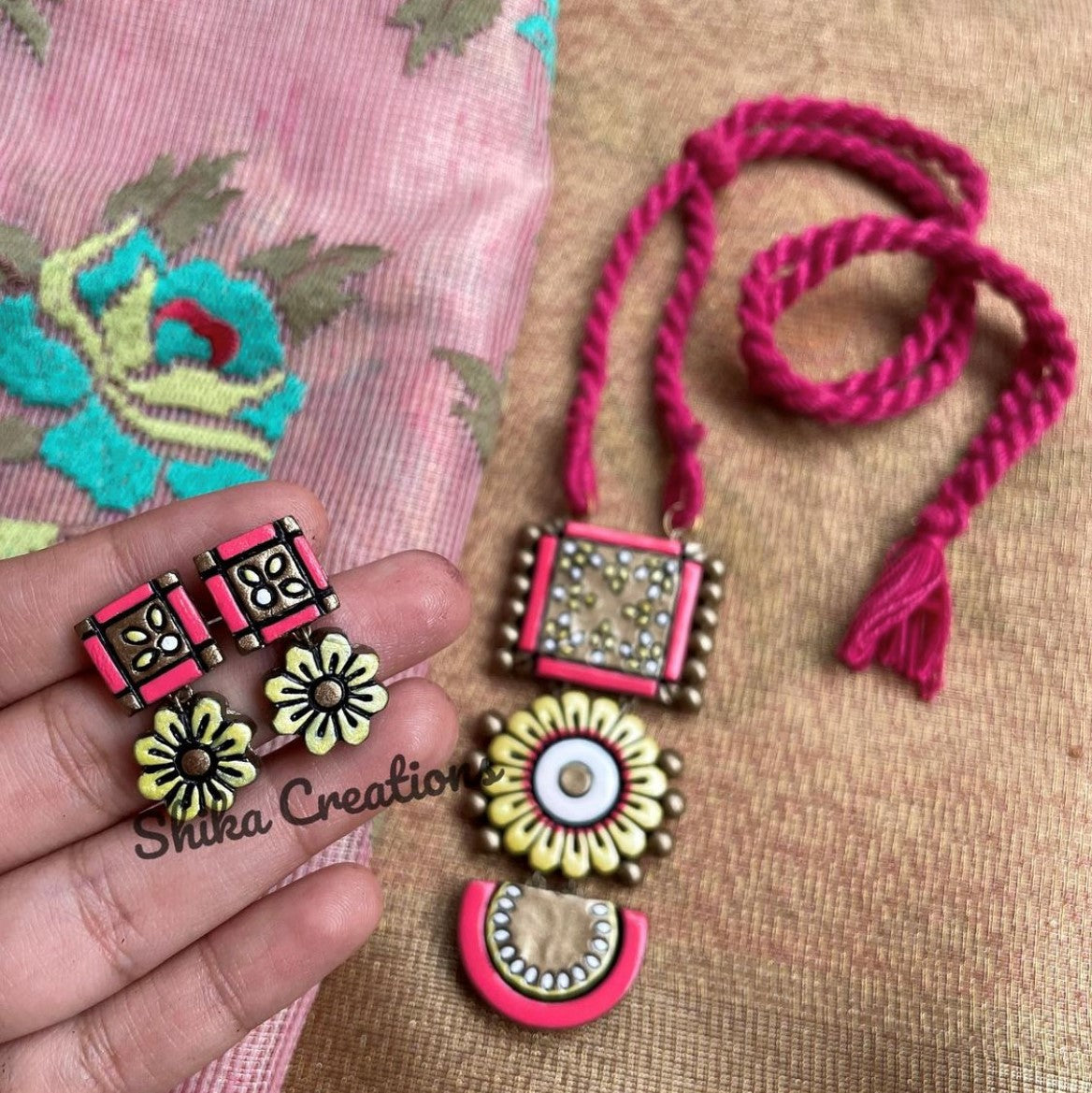 About the Product: Shika's regular wear sets are simple, goes with everything, and can be worn every day to get a sophisticated look. Terracotta 3 step pendant with dangler studs in pastel shades.The neckwear comes with an adjustable dori for the closure.