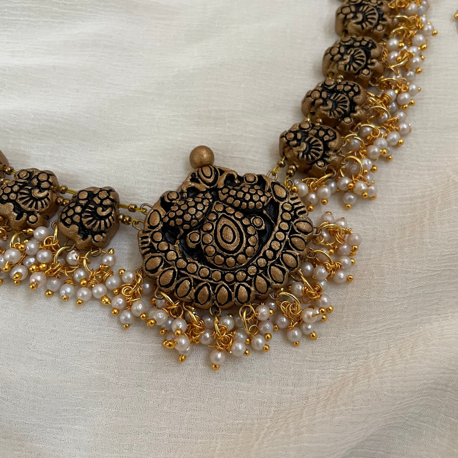 About the Product: This delicate piece of Shika is handcrafted to perfection.Your every moment deserves an elegance and we tune in. Terracotta neckwear with studs in a golden wrap with Pearl danglers.The neckwear comes with adjustable thread for the closure.