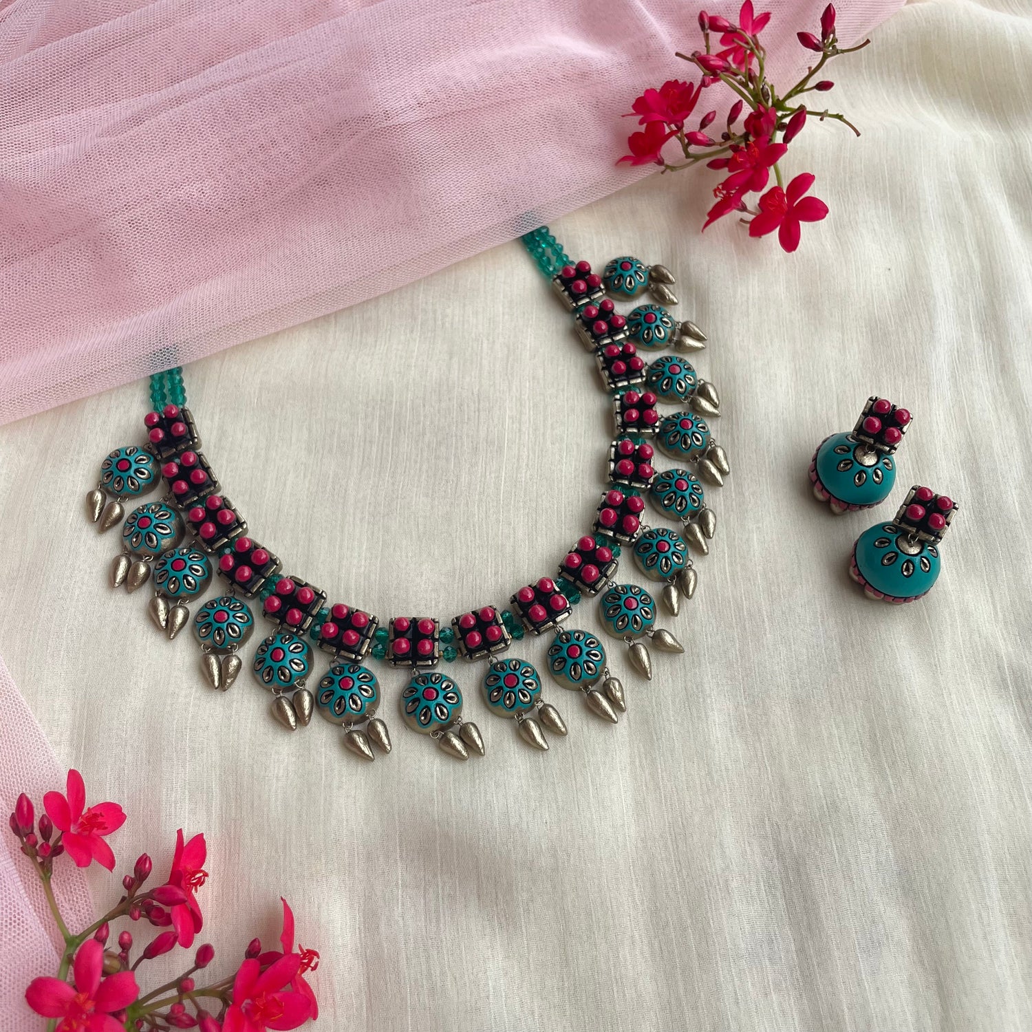 About the Product: This delicate piece of Shika is handcrafted to perfection.Your every moment deserves an elegance and we tune in. Terracotta neckwear with jhumkas in the vibrant deep pink and turquoise shades.The neckwear comes with adjustable thread for the closure.