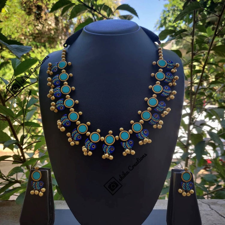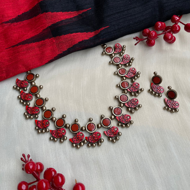 About the Product: This delicate piece of Shika is handcrafted to perfection. Your every moment deserves an elegance and we tune in. Terracotta fish neckwear with studs in vibrant shades. The neckwear comes with an adjustable dori for the closure.