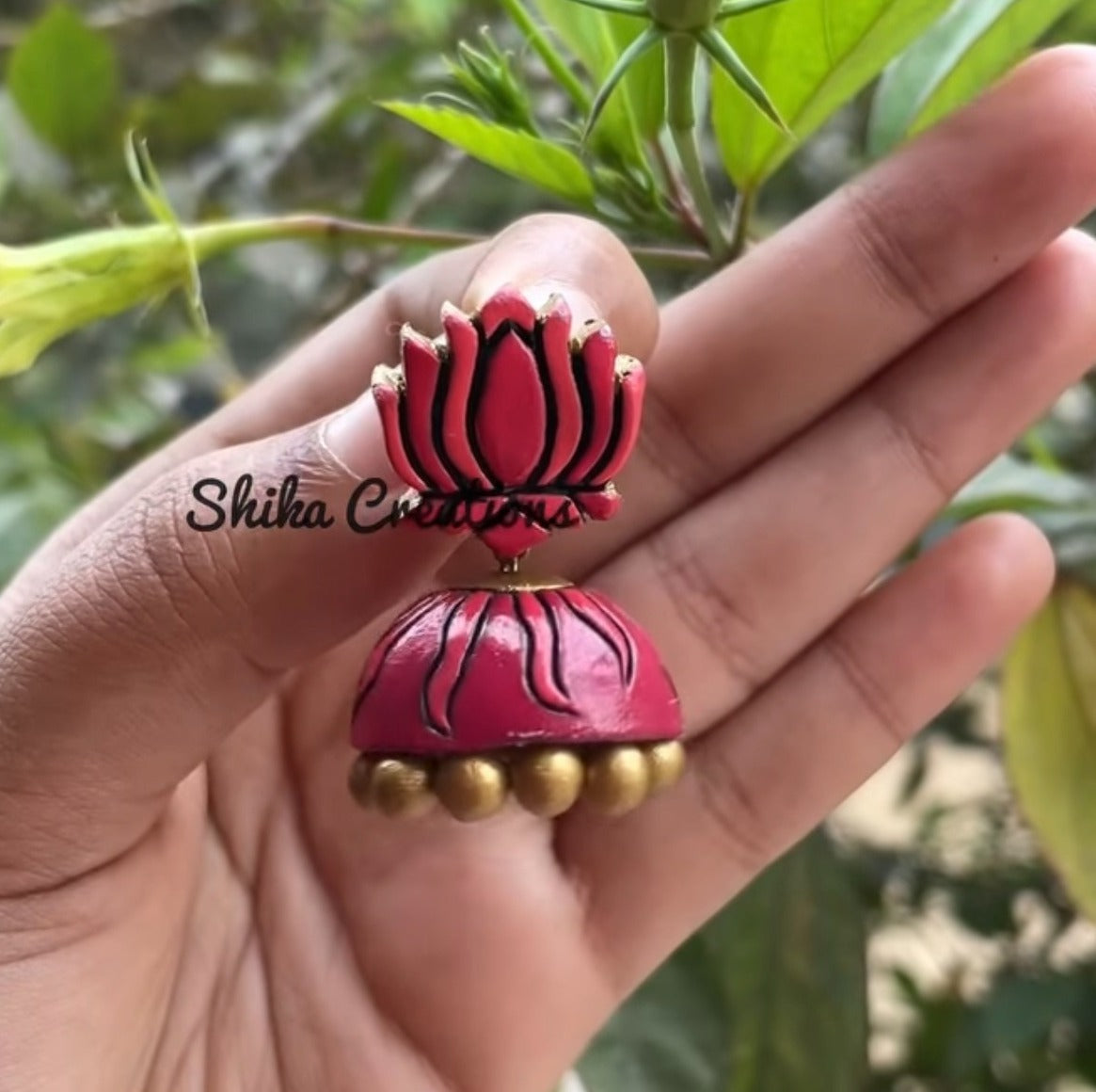 About the Product: You must not be afraid to sparkle a little brighter, Darling! Shika handcrafts the terracotta jhumkas with care and perfection. Terracotta lotus jhumkas in shades of pink and blush.