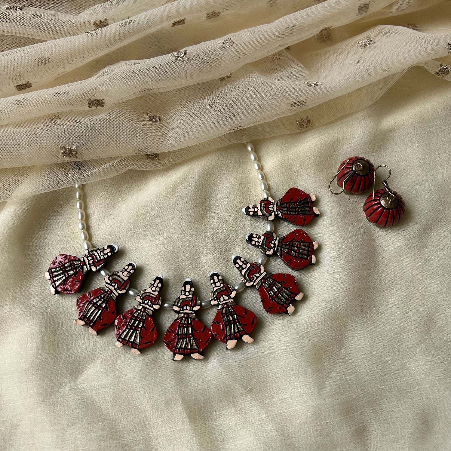 About the Product: This delicate piece of Shika is handcrafted to perfection.Your every moment deserves an elegance and we tune in. Terracotta dancers neckwear with jhumkas in the vibrant shades.The neckwear comes with adjustable thread for the closure.
