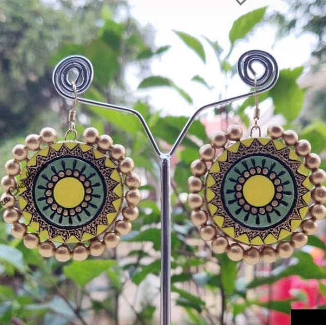 About the Product: Shika's handcrafted chand balis are timeless and look chic despite ever-changing fashions. Terracotta chand bali earings with lollipop beads in yellow and green hues.
