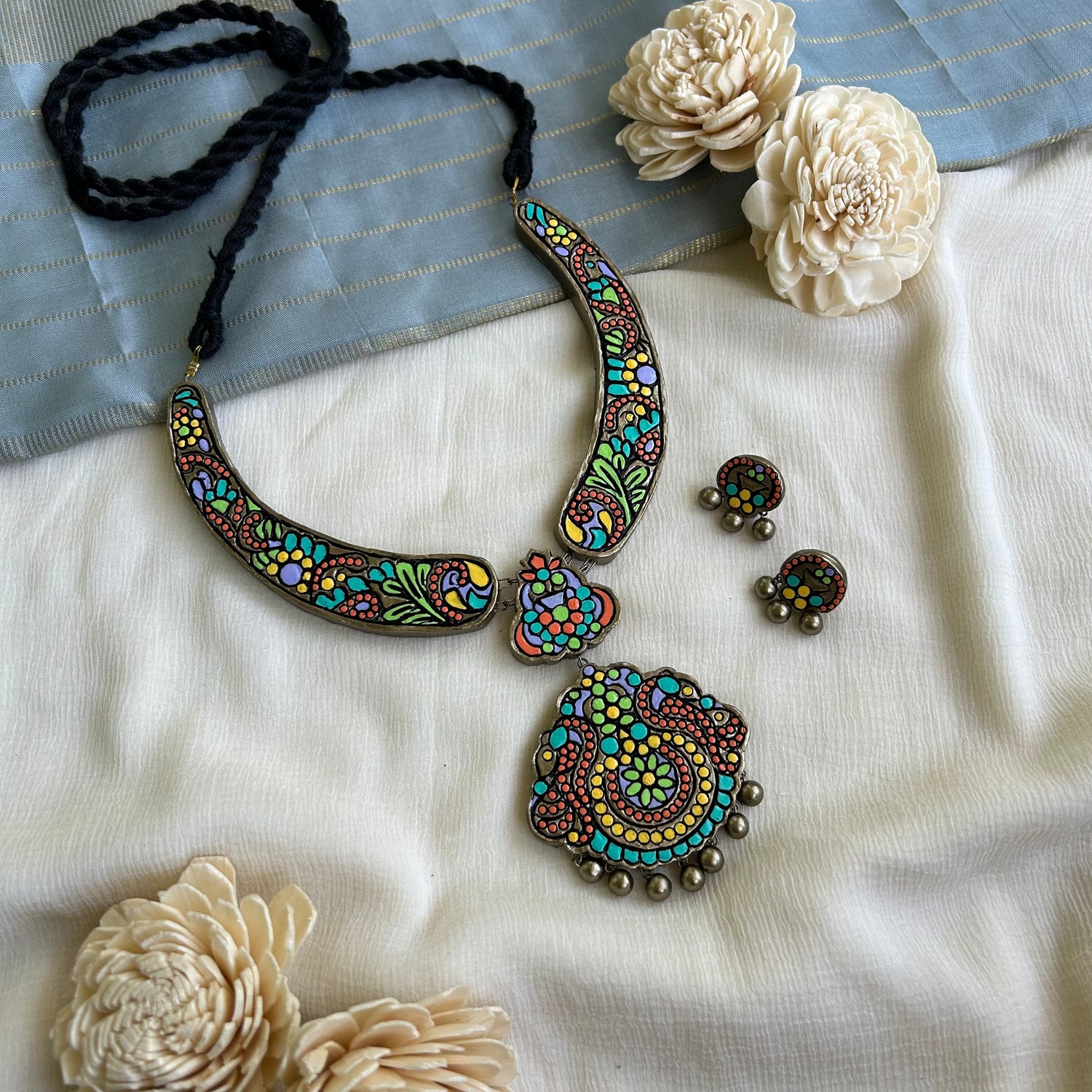 About the Product: This delicate piece of Shika is handcrafted to perfection.Your every moment deserves an elegance and we tune in. Terracotta neckwear with danglers in multicoloured shades.The neckwear comes with adjustable thread for the closure.