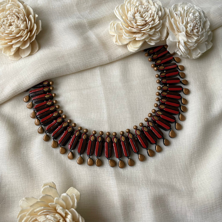About the product - Signatures of Shika! Terracotta neckwear in stunning hues . It is paired with jhumkas. The set comes with an adjustable thread for the closure.