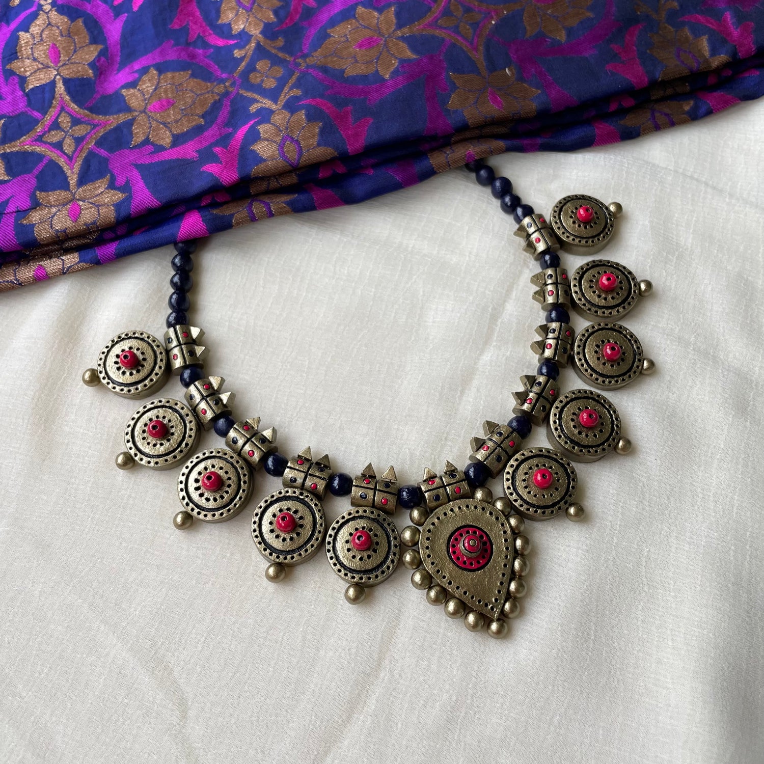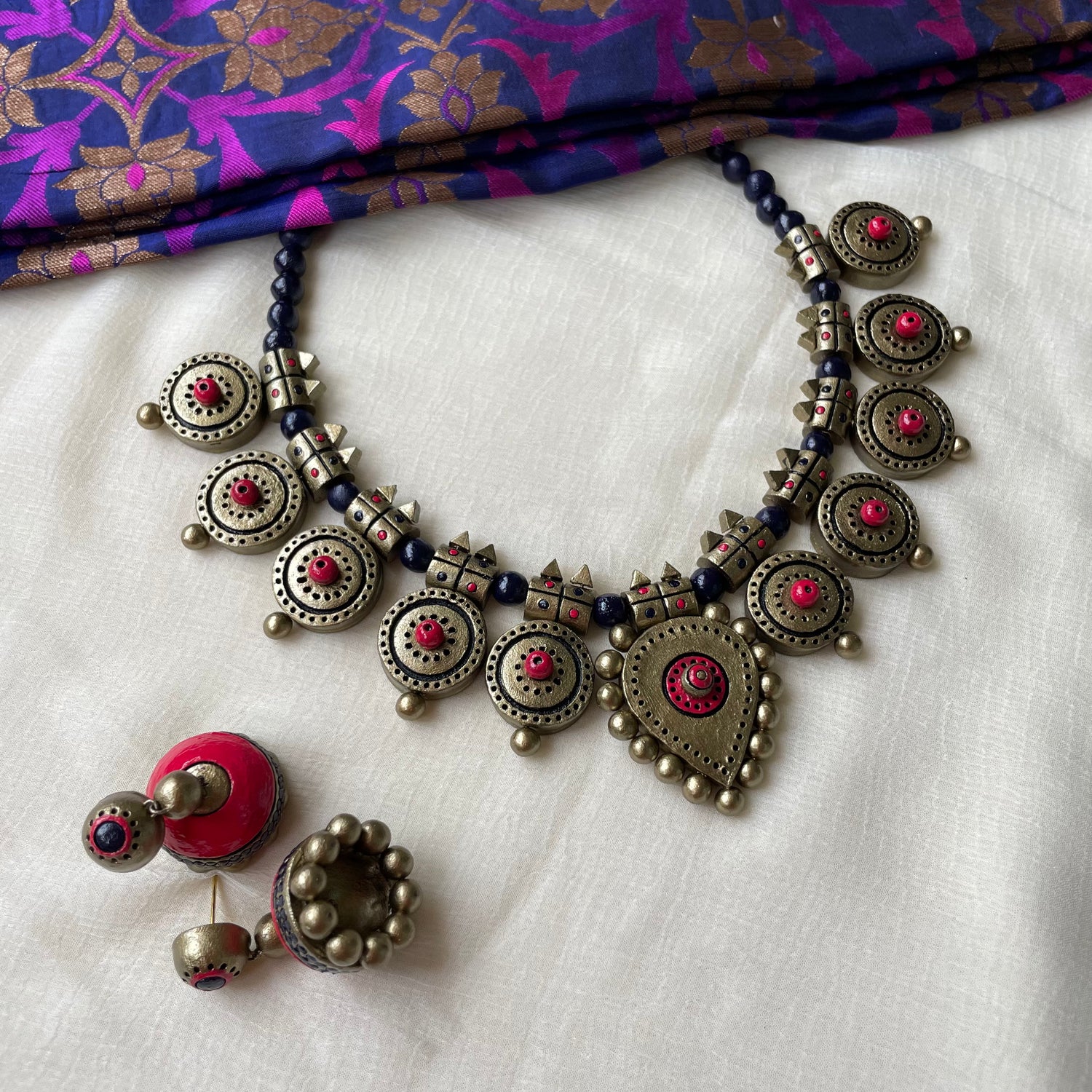 About the product - Signatures of Shika! Terracotta neckwear in stunning hues . It is paired with jhumkas. The set comes with an adjustable thread for the closure.