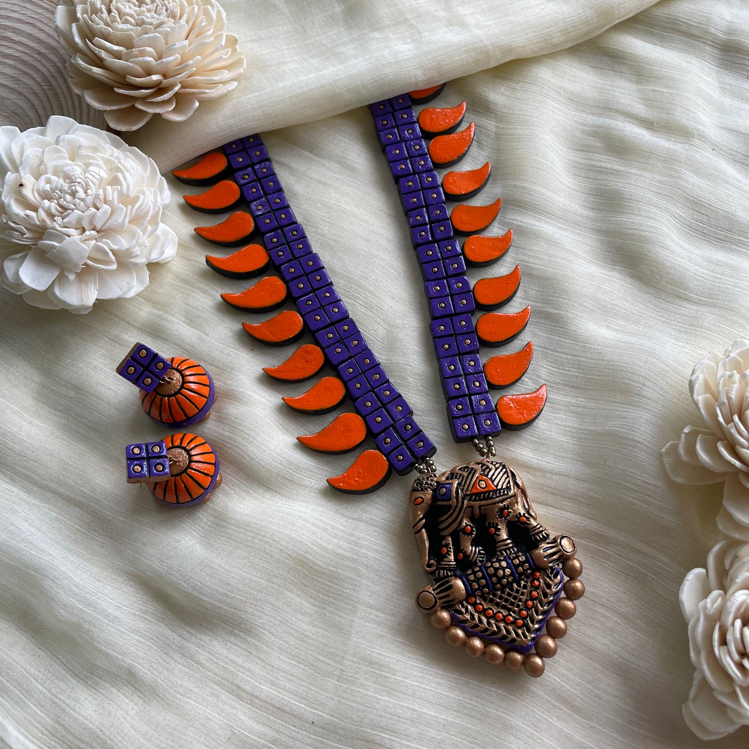 About the Product: This delicate piece of Shika is handcrafted to perfection.Your every moment deserves an elegance and we tune in. Terracotta ganesh neckwear with jhumkas in stunning vibrant shades. The neckwear comes with adjustble dori for the closure.