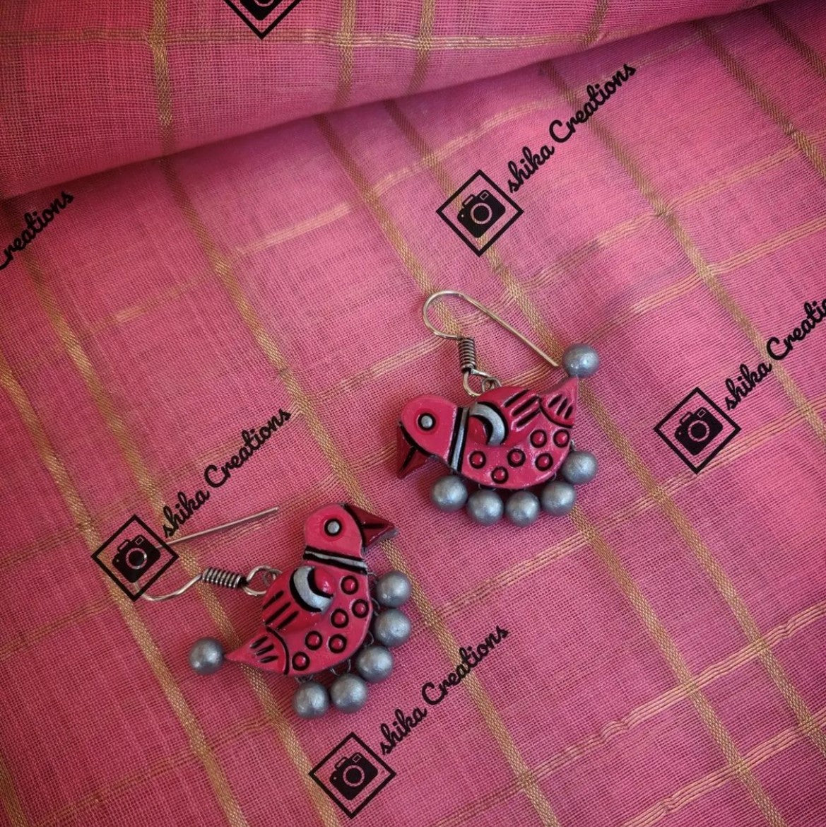 About the Product: Shika's handcrafted danglers are statement earrings that are great for making a powerful impressions. Terracotta dangling birds earrings in silver and pink hues.