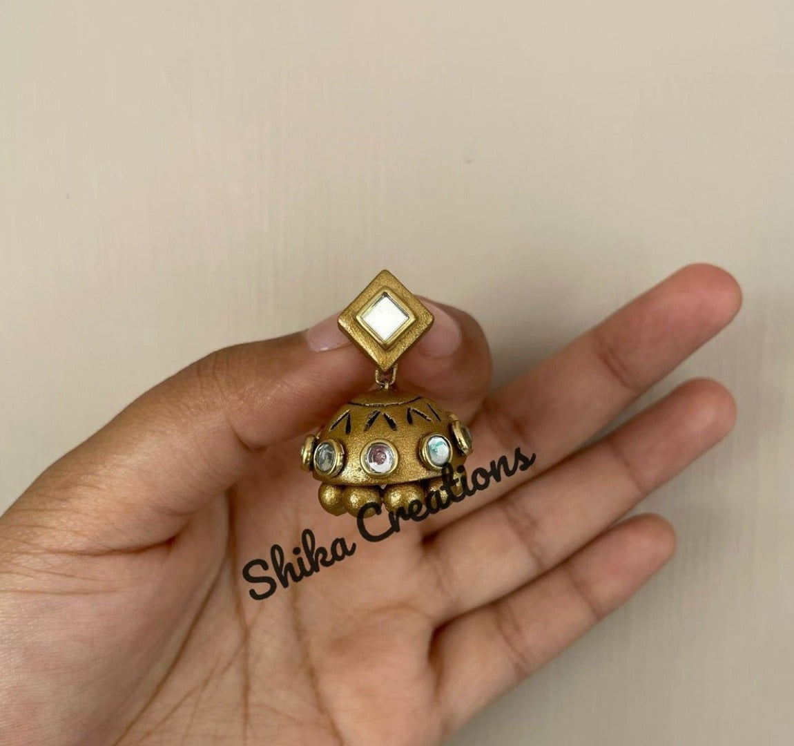 About the Product: You must not be afraid to sparkle a little brighter, darling! Shika handcrafts the terracotta jhumkas with care and perfection. Terracotta jhumkas with kundhan stone embellishments.