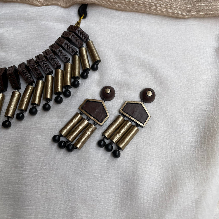 About the Product: Shika blended terracotta with kundhans to get a new stunning look for your outfit. What makes this more special is that this is completely handcrafted. Terracotta choker cum neckwear with dangers in coffee brown, black and antique hues. The neckwear comes with adjustable chain for the closure.