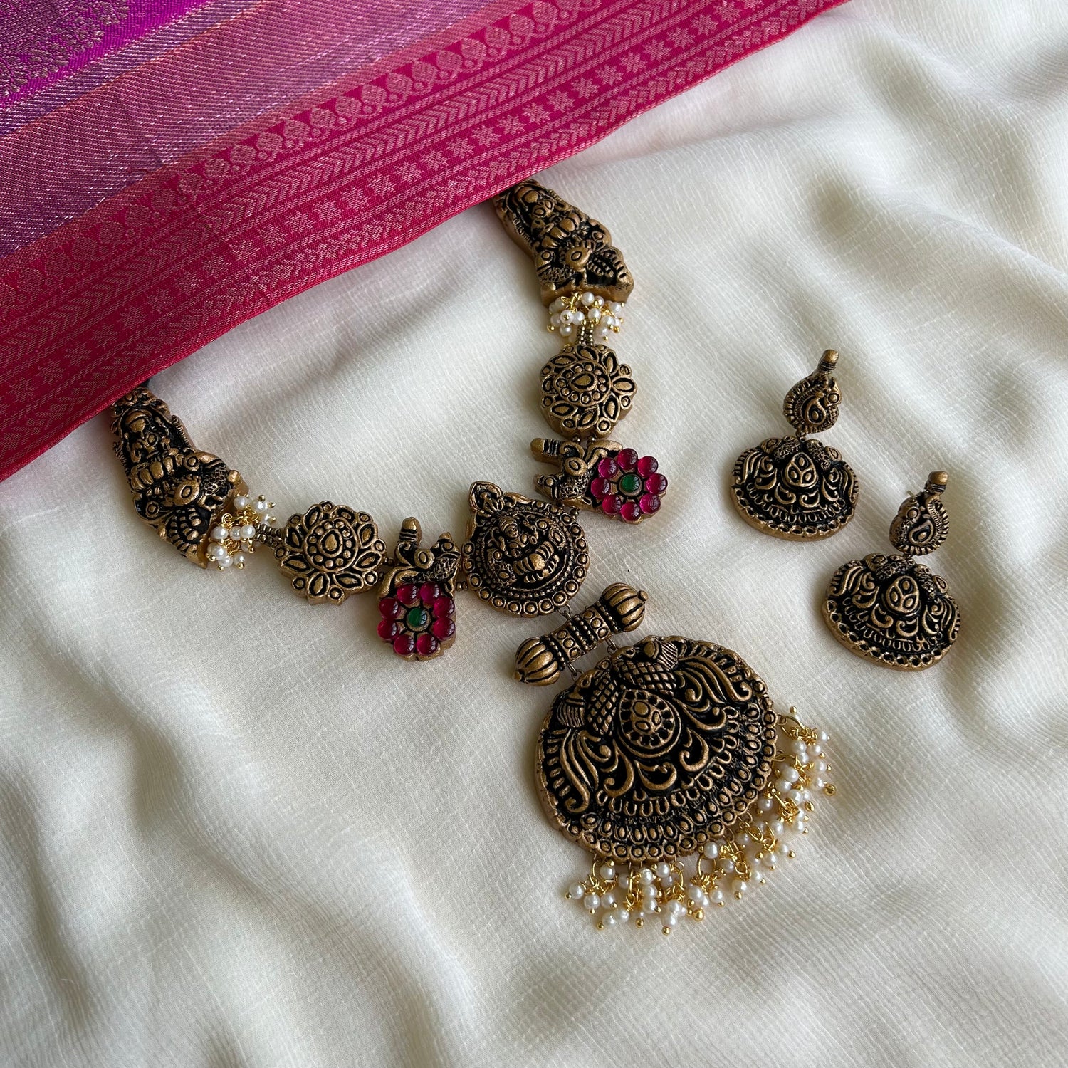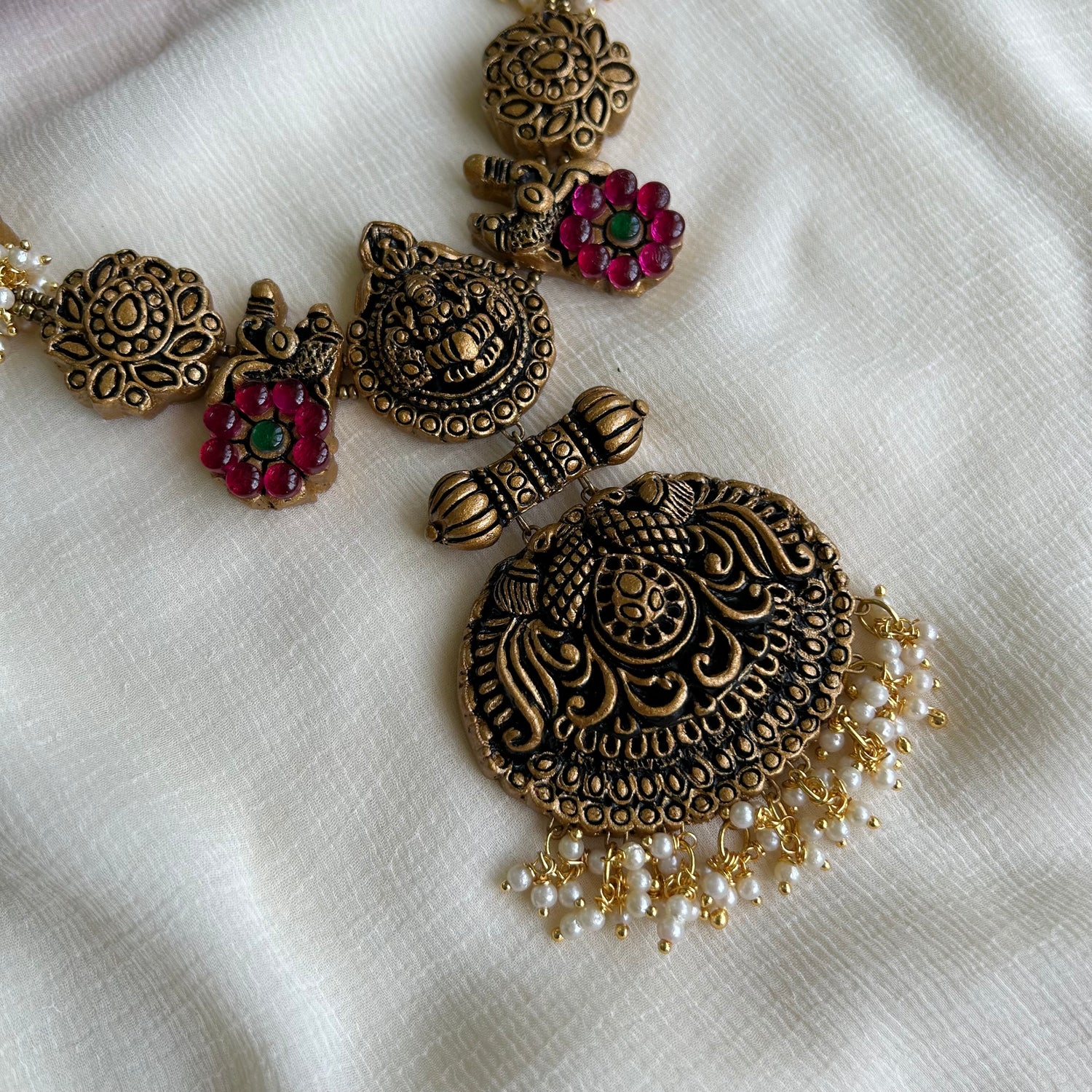 About the product: Shika blended terracotta with kemp stones to get a brilliant new look for your outfit. Kemp stones are semi-precious stones and they dazzle in bright ambiance. What makes this more special is that this is completely handcrafted. Terracotta neckwear with kemp stone embellishments and danglers. The neckwear comes with adjustable chain for the closure.