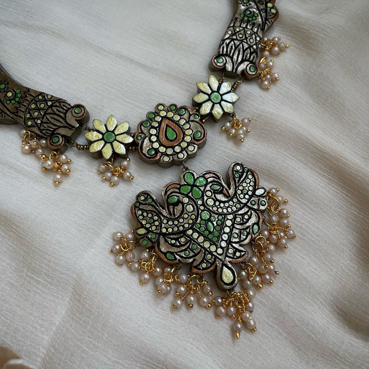 About the product - Signatures of Shika! Terracotta neckwear in stunning hues . It is paired with jhumkas. The pastel set comes with an adjustable thread for the closure.