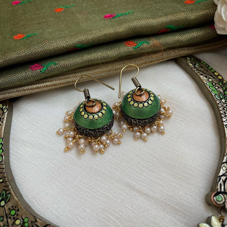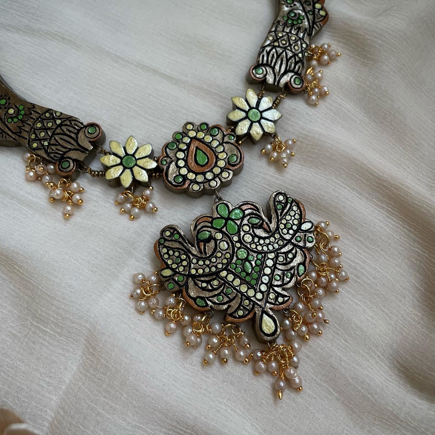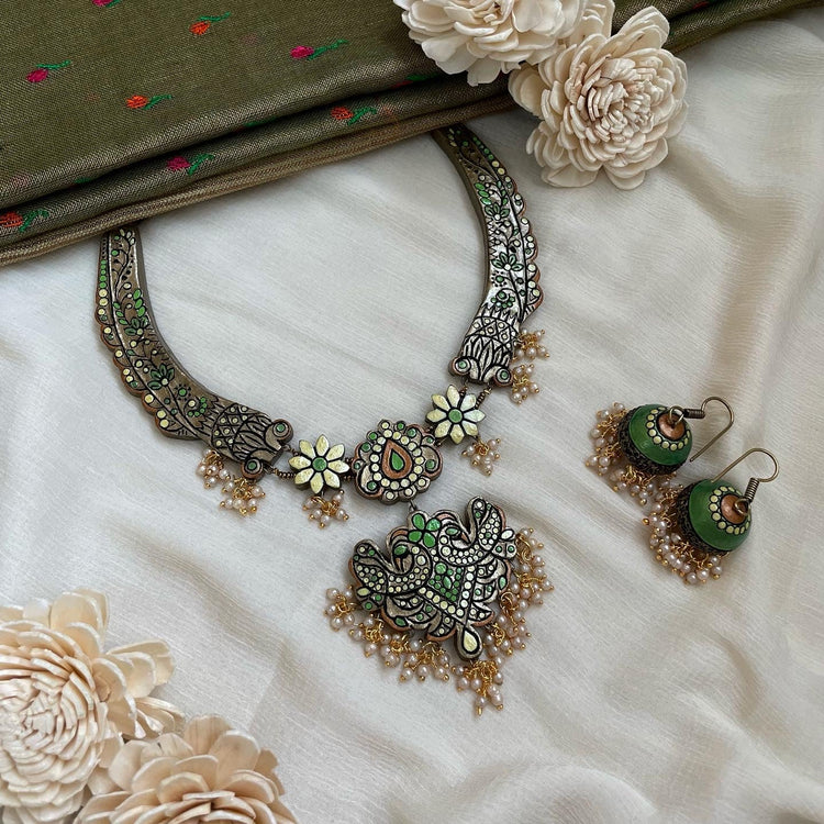 About the product - Signatures of Shika! Terracotta neckwear in stunning hues . It is paired with jhumkas. The pastel set comes with an adjustable thread for the closure.