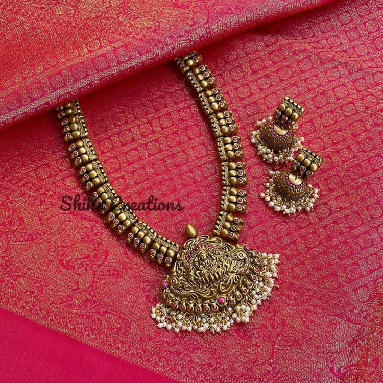 About the Product: This delicate piece of Shika is handcrafted to perfection. Your every moment deserves an elegance and we tune in. Terracotta traditional haram and jhumkas with pearl danglers. The neckwear comes with an adjustable chain for the closure.
