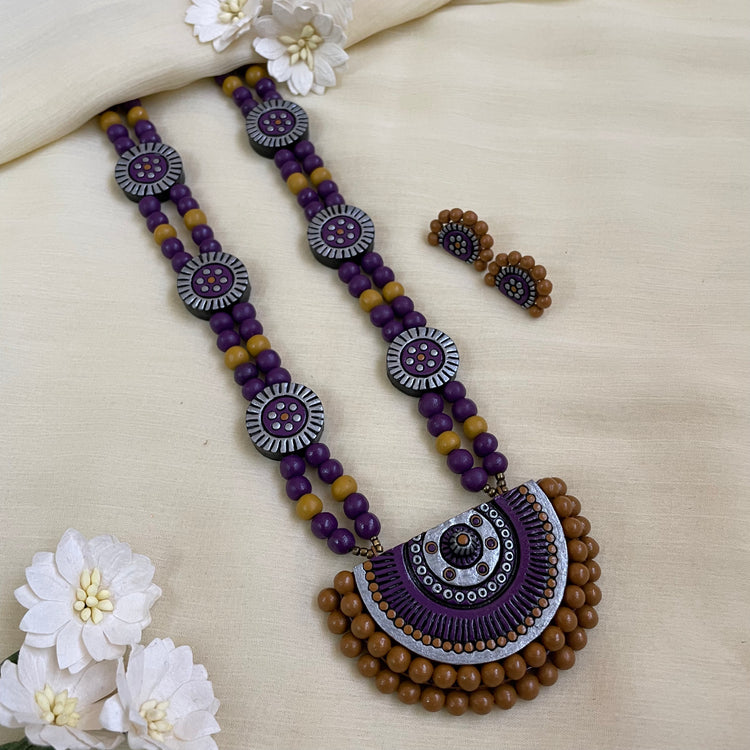 About the Product: This delicate piece of Shika is handcrafted to perfection. Your every moment deserves an elegance and we tune in. Terracotta neckwear with studs in purple shades. The neckwear comes with an adjustable dori for the closure.