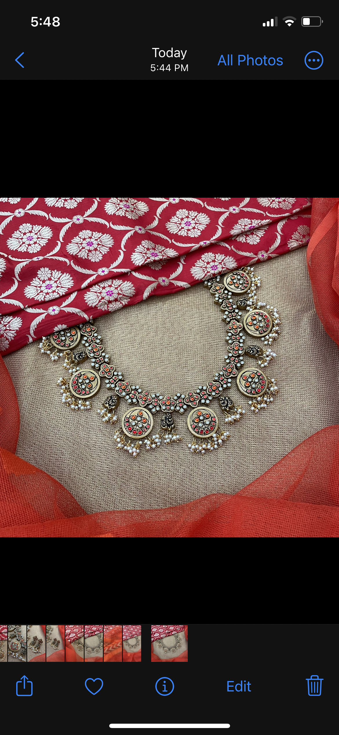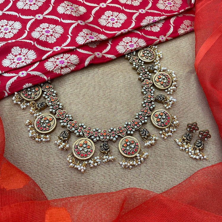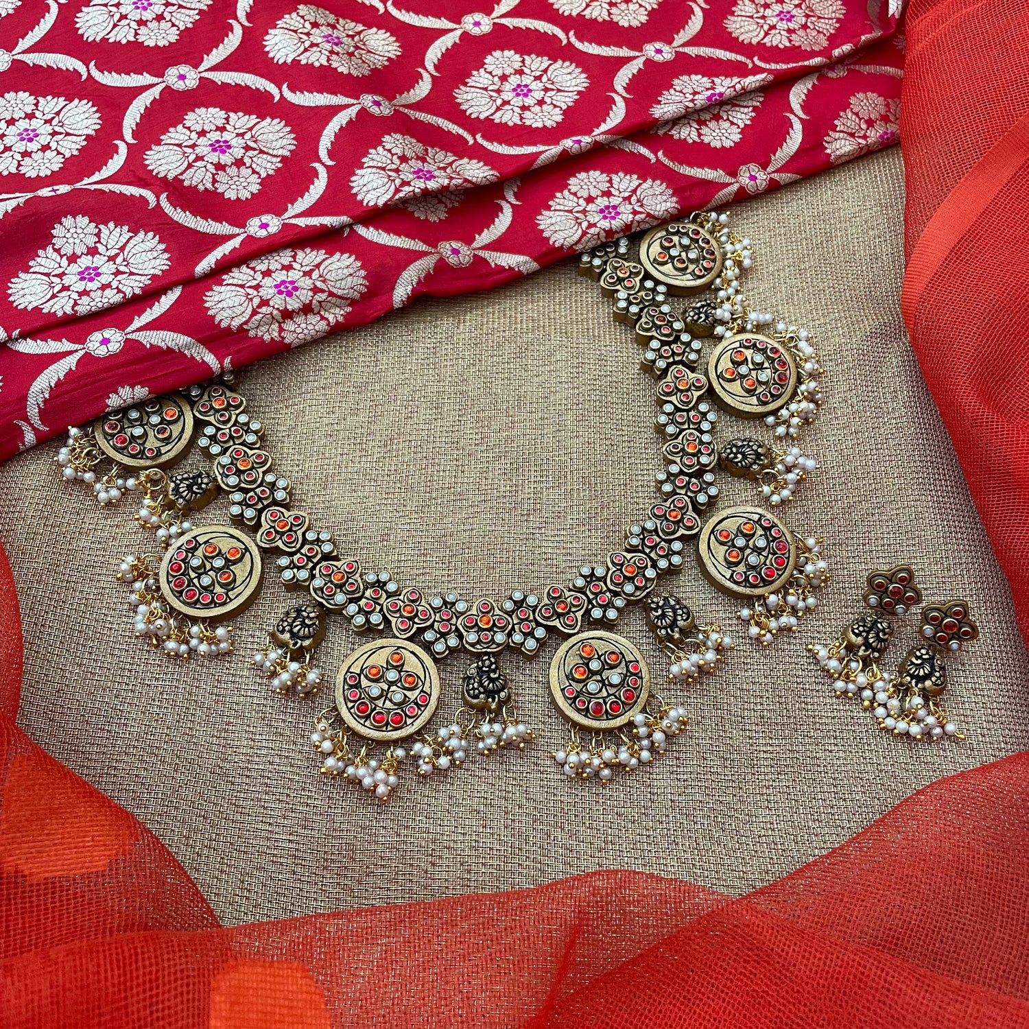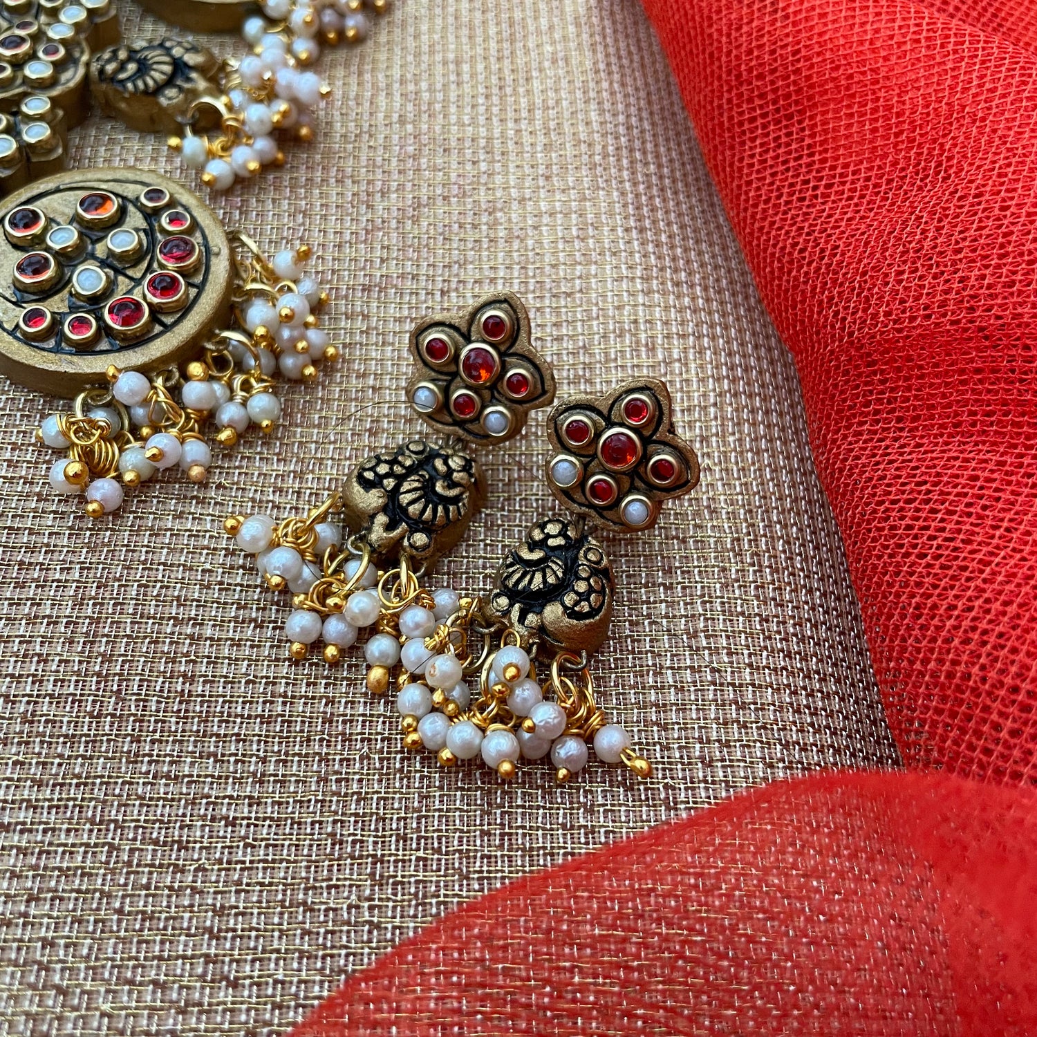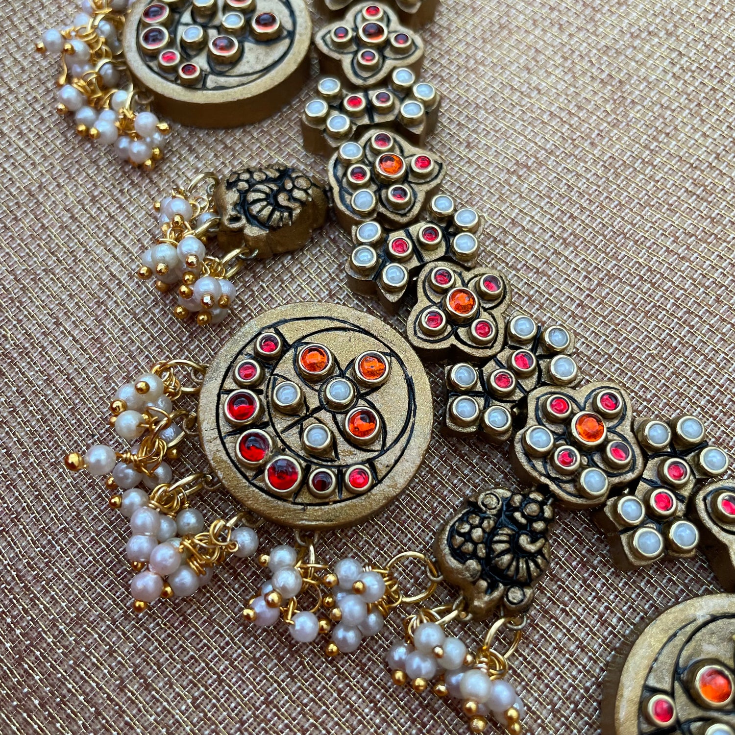 About the Product: This delicate piece of Shika is handcrafted to perfection.Your every moment deserves an elegance and we tune in. Terracotta neckwear with danglers in the endless gold shades with kundhan stone embellishments and Pearl danglers .The neckwear comes with adjustable thread for the closure.