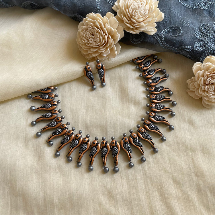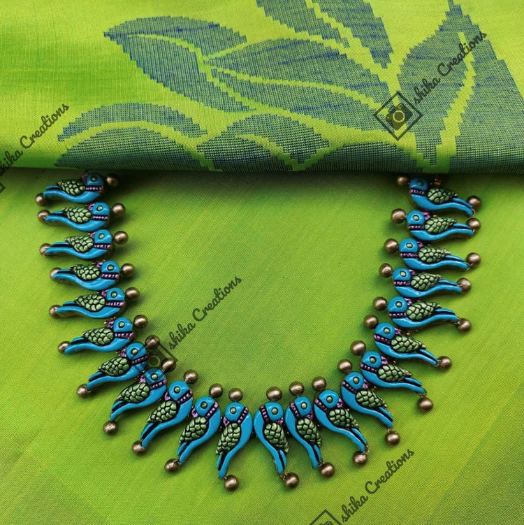 About the Product: This delicate piece of Shika is handcrafted to perfection. Your every moment deserves an elegance and we tune in. Terracotta parrot neckwear with studs in stunning shades. The neckwear comes with an adjustable dori for the closure.