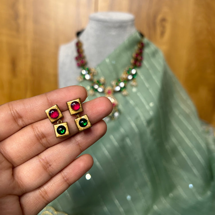 About the product: Terracotta neckwear with Kundhan and kemp stone embellishments and terracotta danglers in beautiful stunning shades of stones in a golden wrap. The neckwear comes with adjustable thread for the closure.
