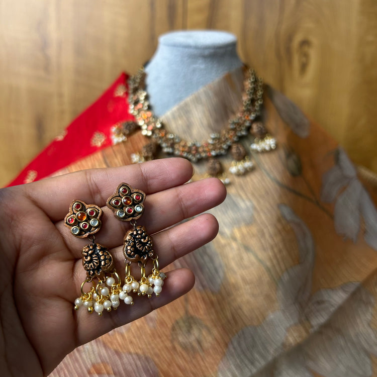 About the product: Terracotta neckwear with Kundhan stone embellishments and pearls and terracotta danglers in beautiful stunning shades of stones in a golden wrap. The neckwear comes with adjustable thread for the closure.