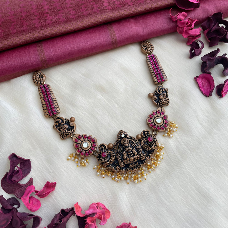 About the Product: This delicate piece of Shika is handcrafted to perfection.Your every moment deserves an elegance and we tune in. Terracotta traditional neckwear with studs in the antique shades with kemp stones. Kemp stones are semi precious natural stones.The neckwear comes with adjustable thread for the closure.