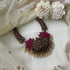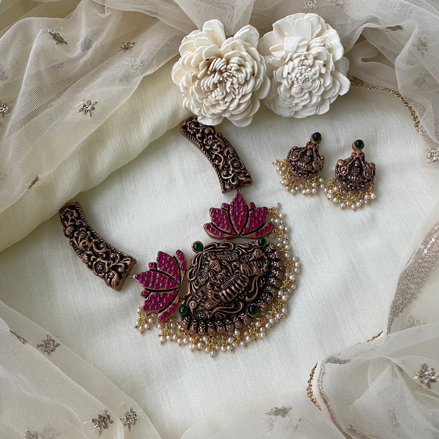 About the product - Signatures of Shika! Terracotta Lakshmi neckwear with kemp stone embellishments and pearl danglers. It is paired with studs with pearl danglers. The set comes with an adjustable chain for the closure.