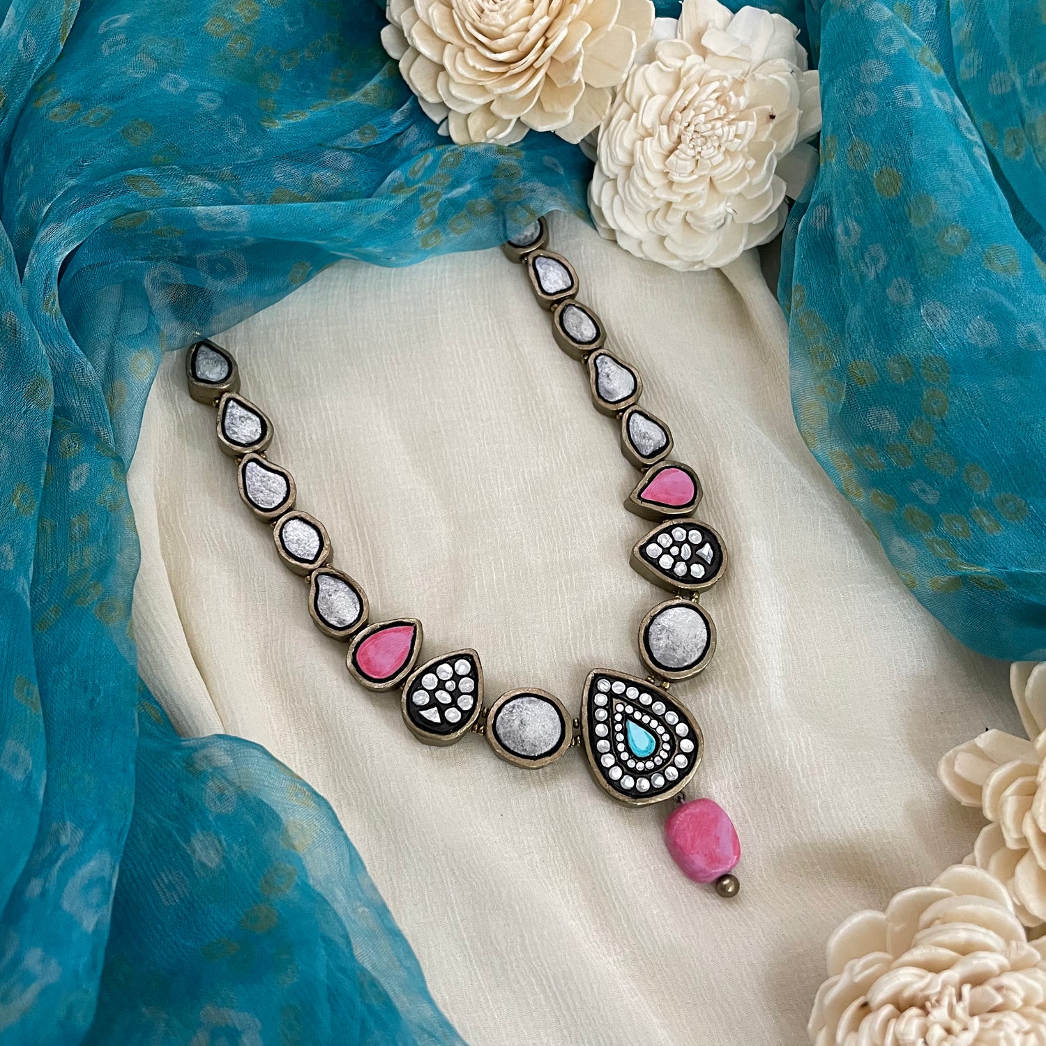 About the product - Handmade Jewellery Signatures of Shika! Terracotta neckwear in stunning hues . It is paired with danglers. The set comes with an adjustable thread for the closure.