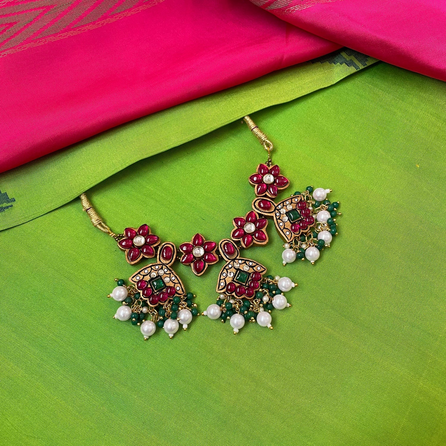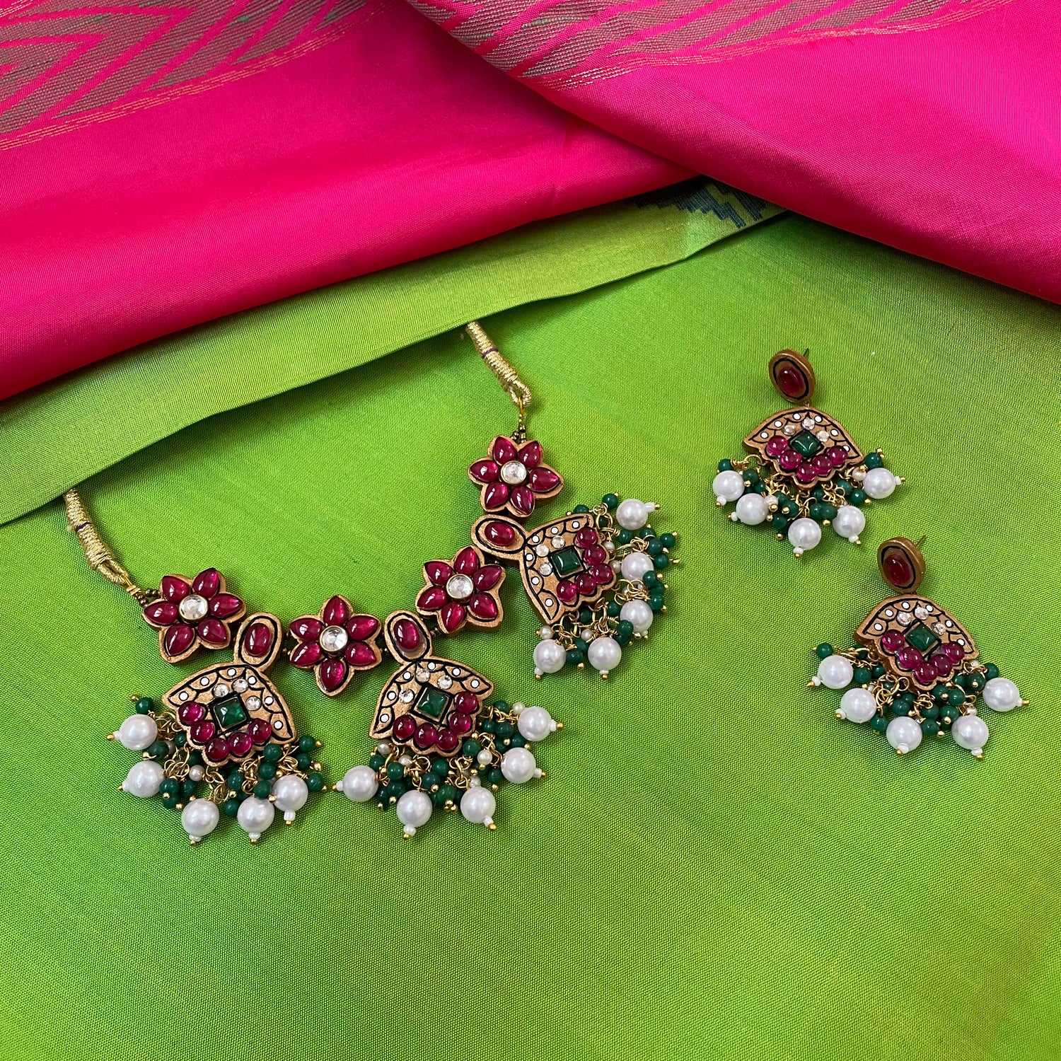 About the product: Shika blended terracotta with kemp stones to get a brilliant new look for your outfit. Kemp stones are semi-precious stones and they dazzle in bright ambiance. What makes this more special is that this is completely handcrafted. Terracotta neckwear with kemp stone embellishments and danglers. The neckwear comes with adjustable chain for the closure.