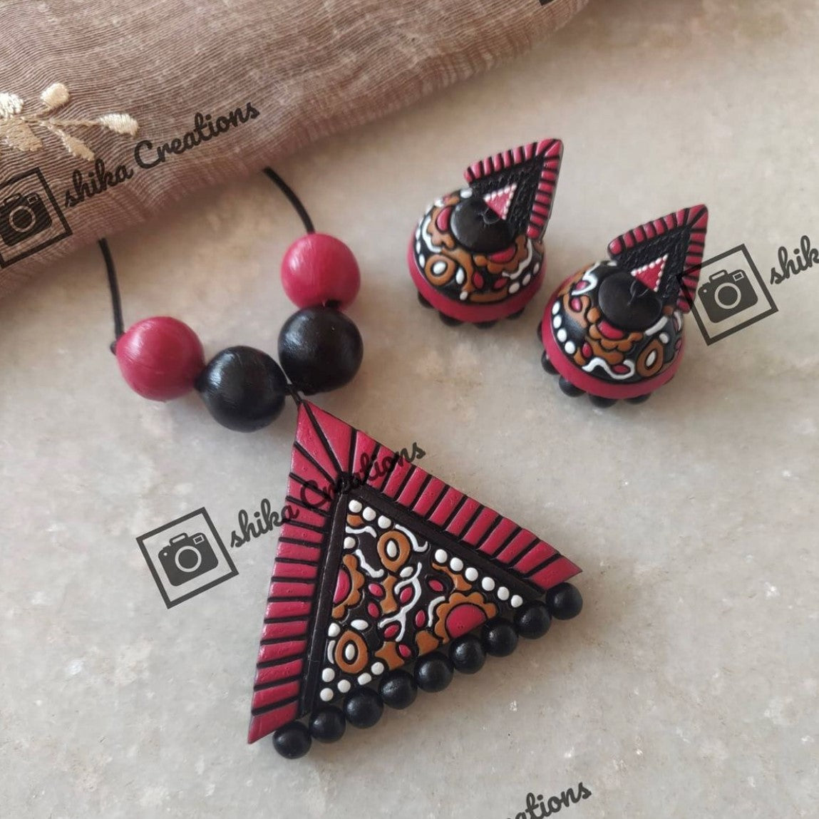 About the Product: Shika's regular wear sets are simple, goes with everything, and can be worn every day to get a sophisticated look. Terracotta pendant with jhumkas in kalamkari shades. The neckwear comes with an adjustable dori for the closure.